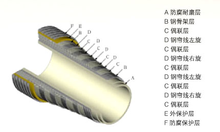 防腐耐磨層是構成輸送流體的管壁,是高密聚乙烯(HDPE)尼龍和聚偏二氟乙烯(PVDF)添加劑等高分子材料擠塑聚合物。選用的材料要在化學理化性能上能抵抗擬輸送的流體的腐蝕磨擦作用,且不受其工作條件的影響。